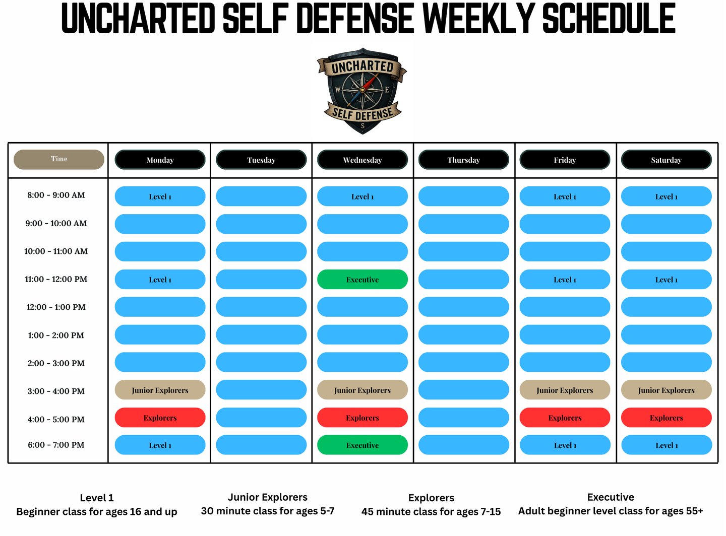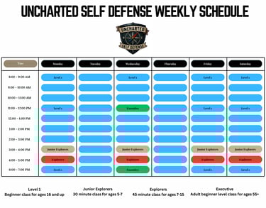 This is a class we offer for those adventurers that are ages 55+. They are still one hour in length and cover all of the same techniques and situational self defense training as our regular adult classes however, there is less of an emphasis on physical conditioning.
